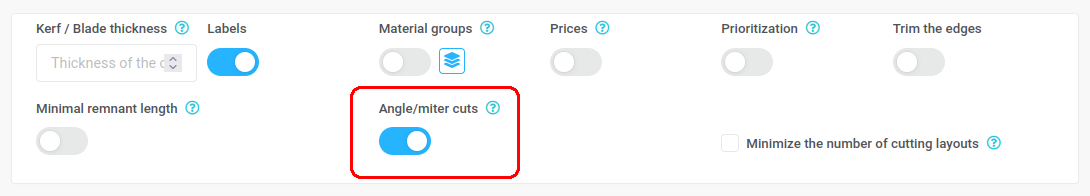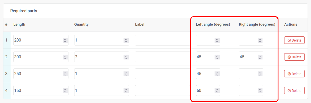 3) Finally, enter Left angle and Right angle for each desired part that you want to cut at an angle. The minimum allowed value is 10° and the maximum value is 170°. If one or both angles are right angles, you can leave the field blank or enter the number 90.