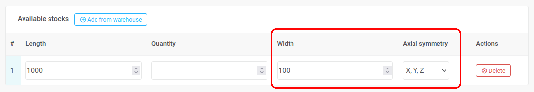 2) Fill in the fields Width and Axial symmetry. To correctly calculate the orientation and placement of parts with angles, we need to know the width of the material and the axial symmetry of the material.