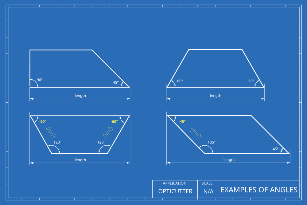 The form always expects the values of the bottom angles of the required parts. If the bottom angle is greater than 90° and you prefer to enter the top angle, you must enter it as a negative value. For example: if the bottom angle is 120°, then the corresponding top angle is 60° (since the top and bottom sides of a quadrilateral are parallel and 180-120=60), so you can enter either 120 or -60 as the angle value.