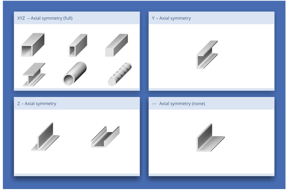 The following figure shows the most common shapes of materials and their corresponding axial symmetry.
