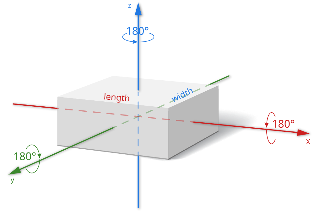 It is symmetry around an axis or line. An object is said to be axisymmetric if its appearance remains unchanged when transformed around an axis. To best place components with angles, we need to know whether the material can be rotated 180° around an axis. Not all material types are axisymmetric around all axes, so we need to know which axes the material can be rotated around. If the material can be rotated around all axes, select "X, Y, Z" from the Axial symmetry drop-down menu. If the material allows rotation around a single axis, select the correct axis name ("X" or "Y" or "Z") from the drop-down menu based on the orientation of the axes in the image below. If the material is completely asymmetric and you do not want to allow any rotation, select "---".